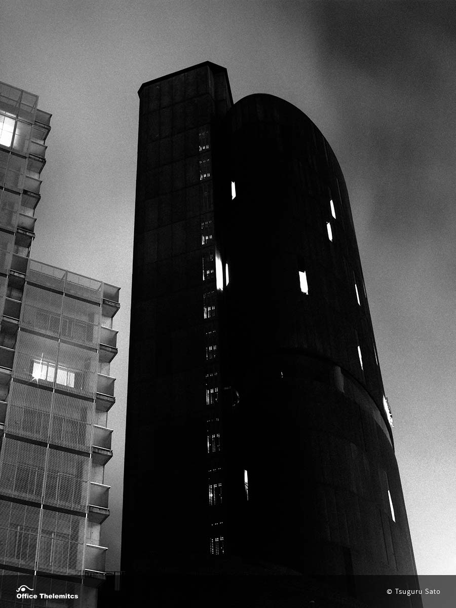 空にそびえる黒い楕円筒形とレンガ造りの土台という独特な外観は、50年以上を過ぎた現在でも、周囲のビル群に溶け込むことなく異彩を放つ。
